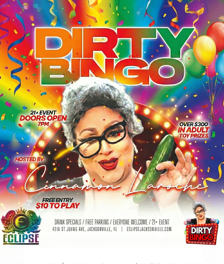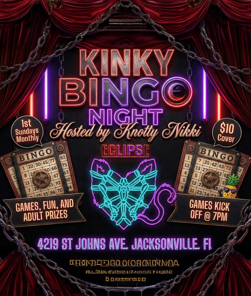 Every 1st SundayJoin Knotty Nikki for an exciting night of Kinky Bingo at Eclipse on the 1st Sunday of every month. Time: Games kick off at 7 PM. Cover: $10. Offerings: Expect games, fun, and adult prizes. Location: Eclipse (4219 St Johns Ave, Jacksonville, FL).