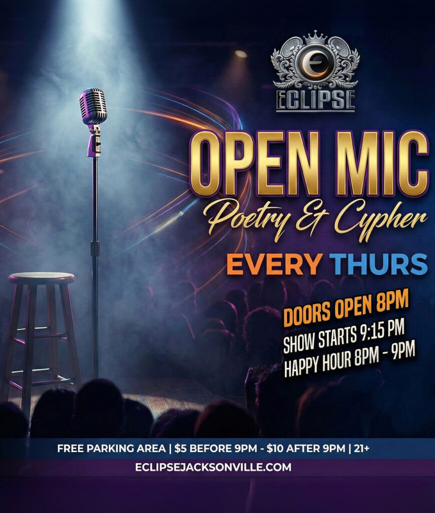 Every ThursdayOpen Mic Poetry & Cypher Experience live local talent Every Thursday night at Eclipse for Open Mic Poetry & Cypher. Schedule: Doors open for Happy Hour from 8 PM – 9 PM, with the show starting at 9:15 PM. Cover: $5 before 9 PM | $10 after 9 PM. Details: This event is 21+ and offers a free parking area.